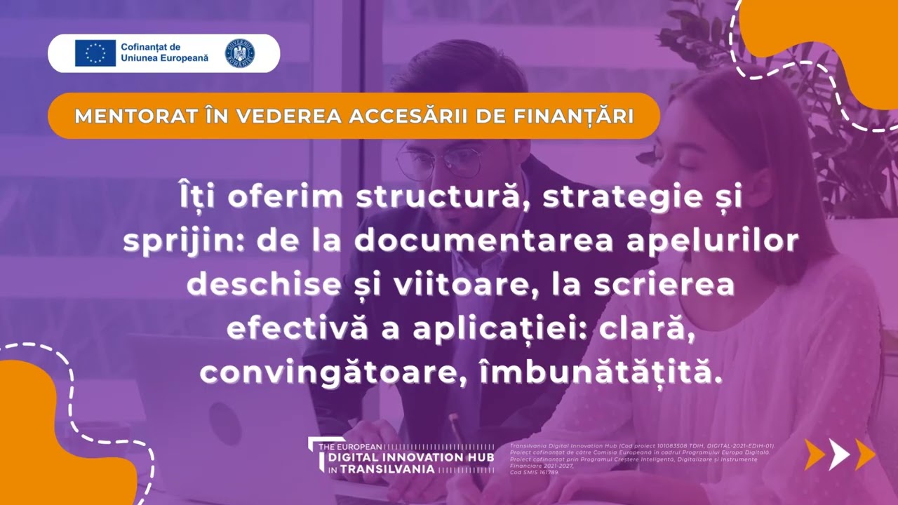 Stația de azi: Mentorat de Business în vederea accesării de finanțări Obținerea de finanțare e un pas important și, de multe ori, necesar. Dar ce faci când nu știi de unde să începi? TEDIHT îți răspunde la toate întrebările și îți oferă sprijin pe tot parcursul călătoriei, de la identificarea apelurilor potrivite, până la scrierea și depunerea aplicațiilor.